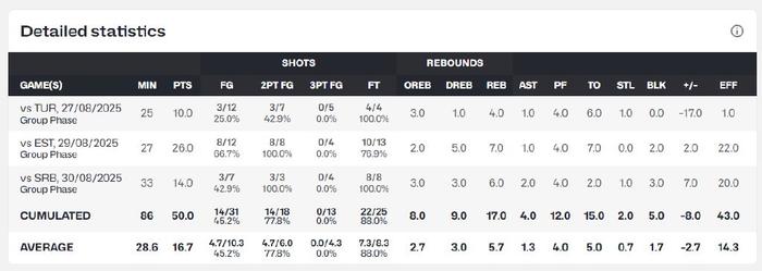 波尔津吉斯这三场比赛只有第二场打爱沙尼亚时拿到20+(命中率超五成),他面对NBA顶级的中锋就是被暴打的局面。