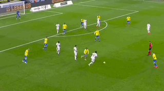 第35分钟,罗德里戈脚下生花连续过人后传中,塞瓦略斯接球后打门被挡出,随后本泽马的补射击中横梁后弹出