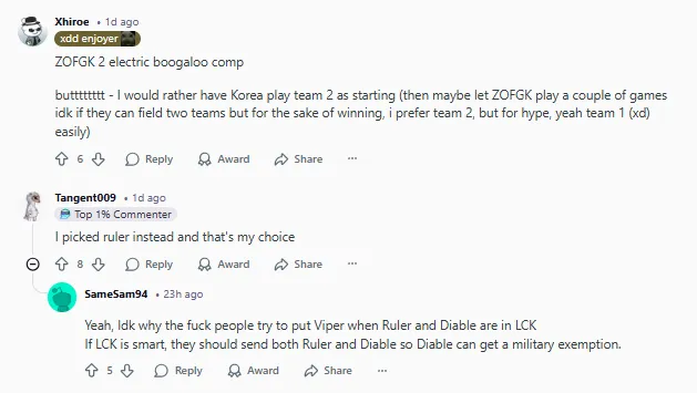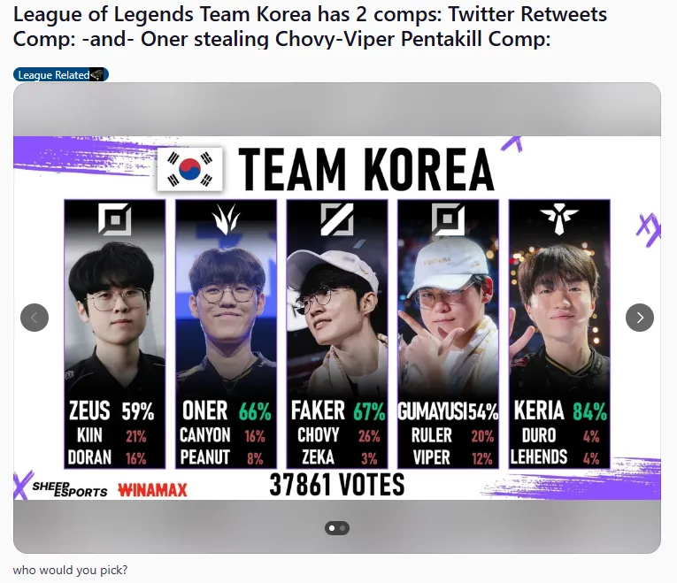 近日,Sheep Esports发起的韩国队阵容投票在外网引起热议,部分评论翻译如下:(未经允许禁止转载、搬运截图)