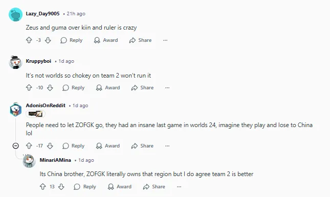 老实说,默契更重要。所以不管Zeus和Guma打得怎么样,直接派出ZOFGK可能是更聪明的选择,因为你们有现成的分工和一套行之有效的体系。