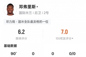 体育资讯6月1日讯 欧冠决赛,国米0-5不敌巴黎。邓弗里斯首发出战,7次对抗成功全场最多,但16次丢失球权也是全场最多,评分6.2。